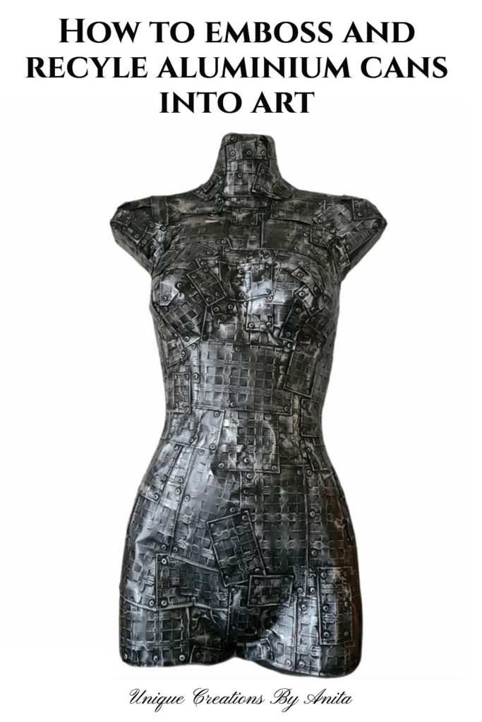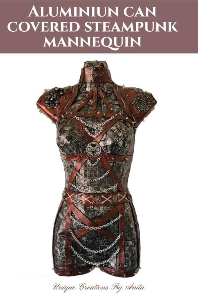 Recycled art doesn’t get much bolder than this Aluminium Can Steampunk Mannequin: Mistress Metallica. After my first steampunk mannequin fooled people into thinking it was real metal, I set out to build an authentic metallic skin using embossed aluminium cans, pop rivets, and leather accents.