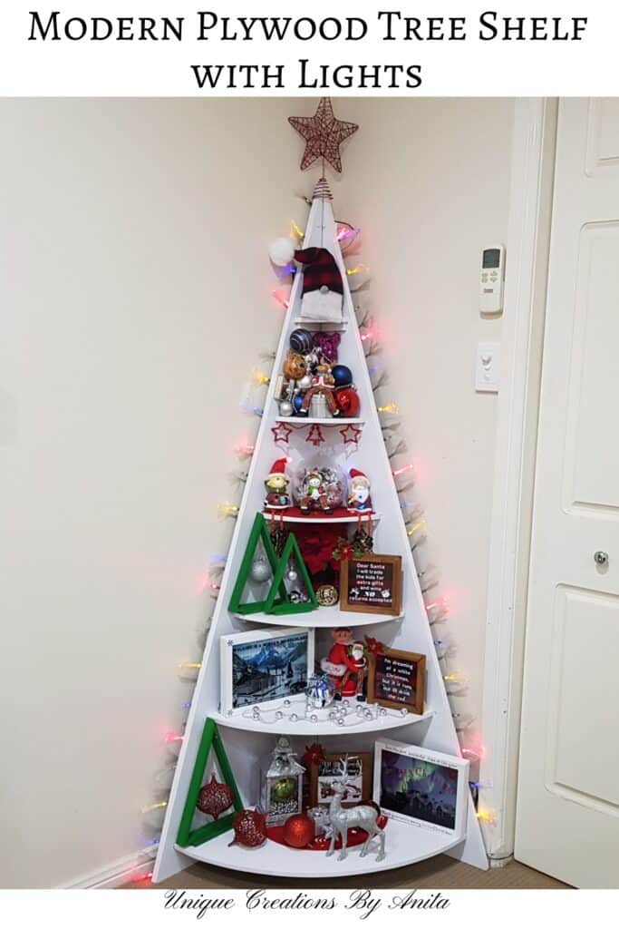 If you’re short on space, build a mini wooden Christmas tree shelf that hangs on the wall or sits on a table.