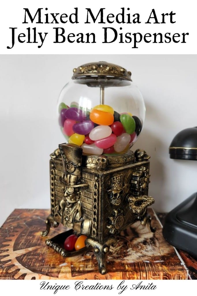 If you follow my blog, you will know that besides DIY, I also love creating mixed media assemblage art. I am always on the lookout for interesting items that can be turned into unique home décor pieces by giving them a mixed media makeover. On a recent visit to my local markets, I came across a quirky jelly bean dispenser in a junk box. The moment I saw it, I knew this jelly bean dispenser was destined for a steampunk makeover. With a bit of imagination, embellishments, and paint, I transformed this ordinary piece into a statement steampunk jelly bean dispenser that looks right at home on a bar counter.
